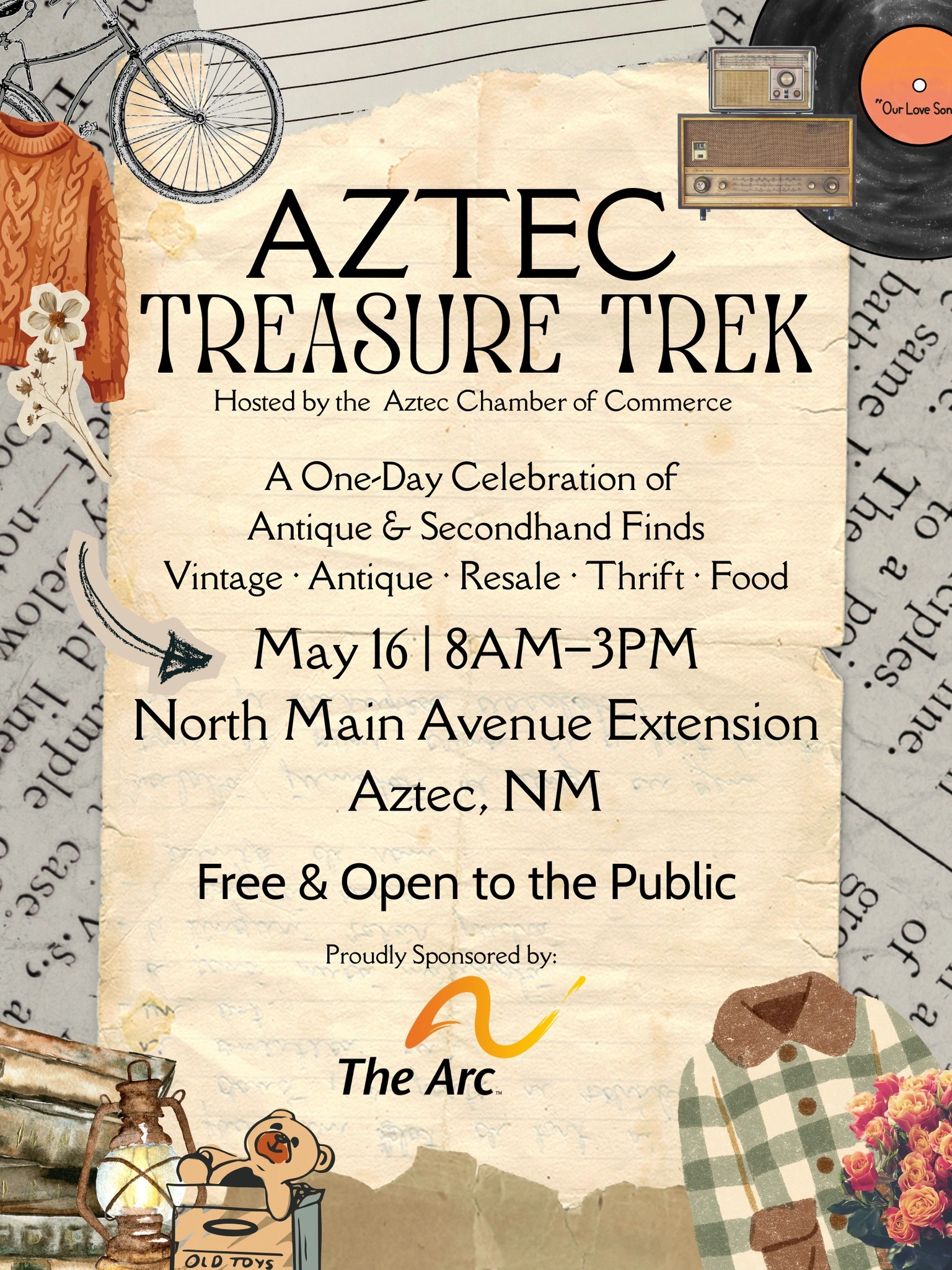 Join us in Aztec for the Aztec Treasure Trek, a one-day outdoor shopping event celebrating the charm of vintage, antique, and secondhand finds! Hosted by the Aztec Chamber of Commerce, this specialty market is the perfect destination for treasure hunters, collectors, and anyone who loves unique, nostalgic items.