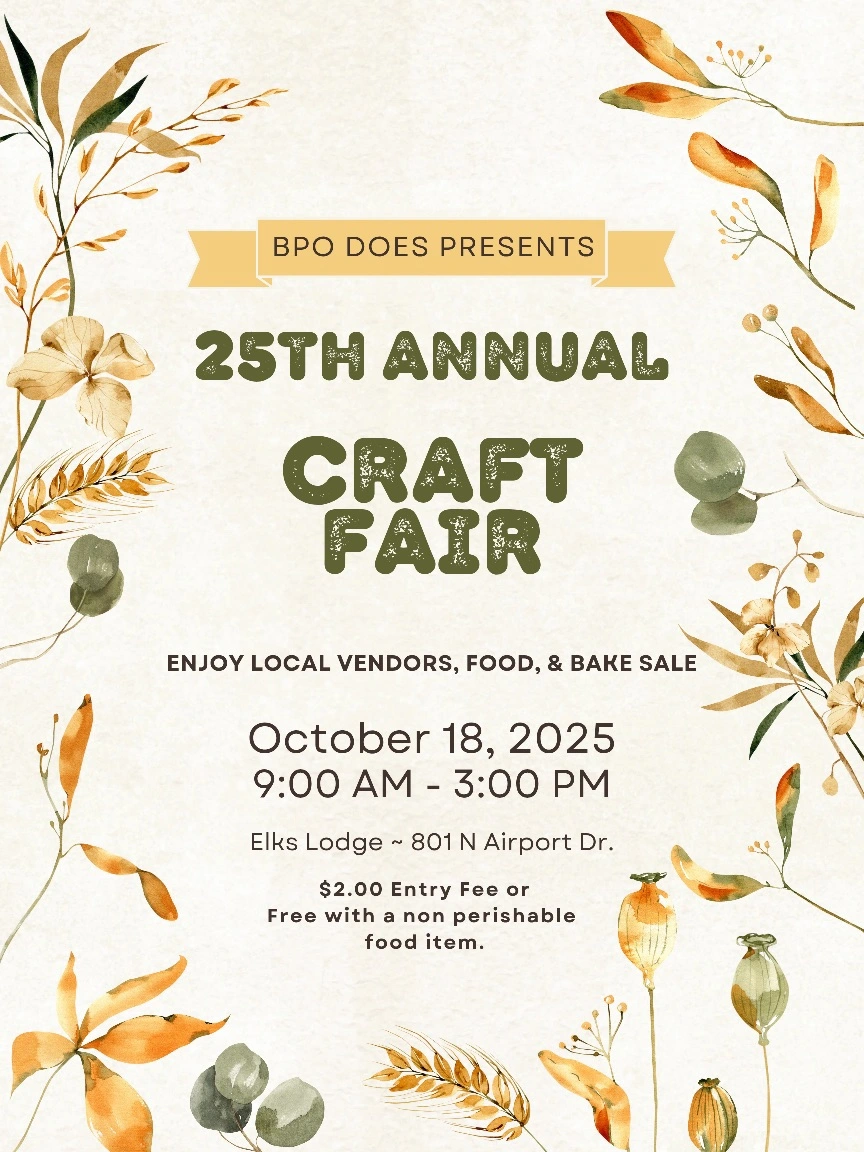 You don't want to miss the the B.P.O. DOES annual Fall Festival Craft Fair! It will be held from 9:00am to 3:00pm on Saturday, October 18th at the Elks Lodge, located at 801 Airport Drive. Enjoy local vendors, food and bake sale! $2 entry or free with non-perishable food item!