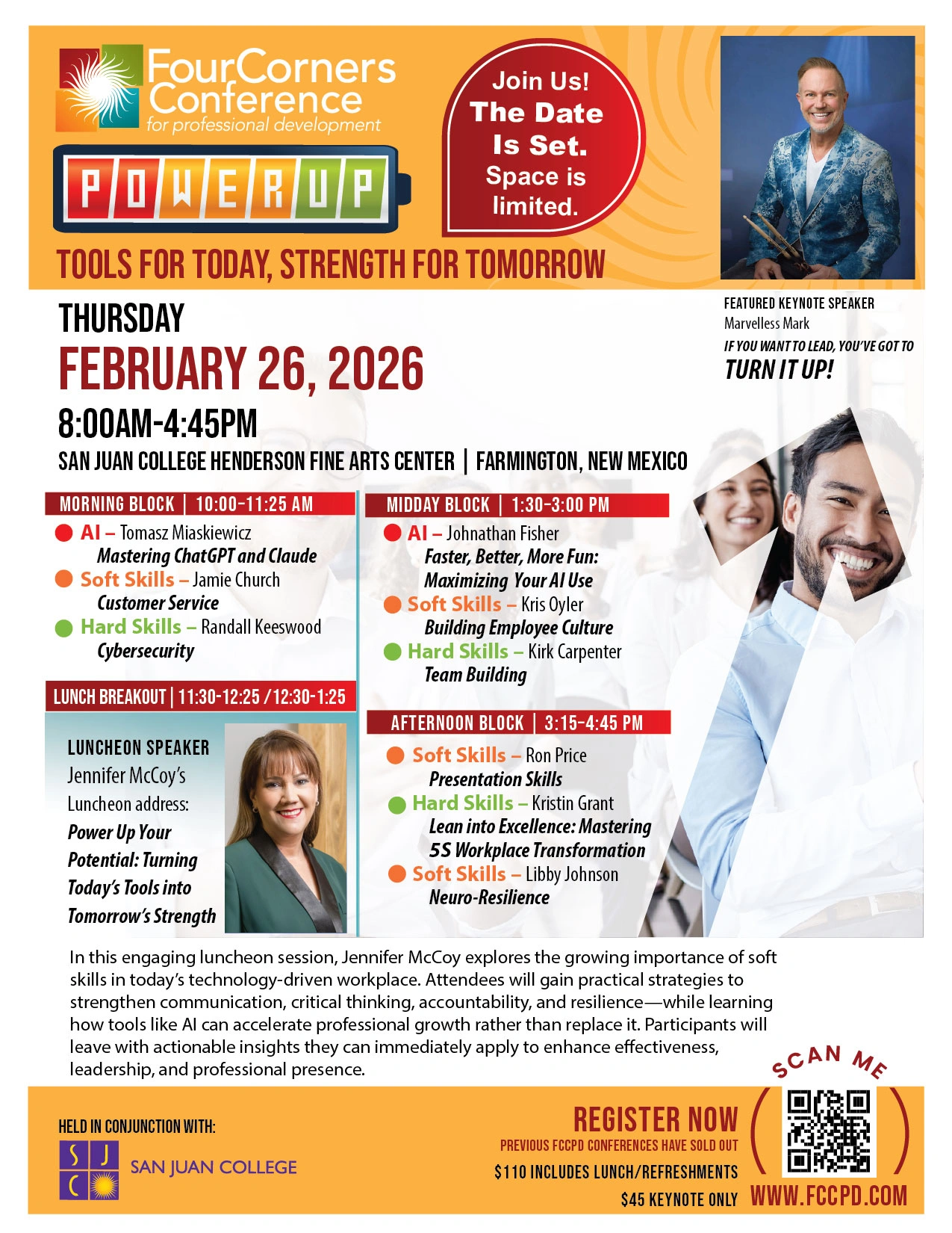 Designed for entry-level to mid-level professionals, supervisors, and emerging leaders, FCCPD delivers a full day of practical, relevant, and inspiring professional development, right here in the Four Corners region.
