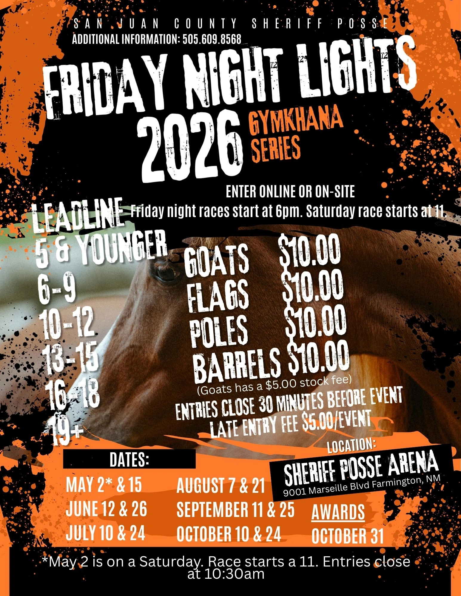 Join the San Juan County Sheriff's Posse for Friday Night Lights 2026 Gymkhana Series! PLEASE READ FULL EVENT DESCRIPTION FOR ALL DATES AND TIMES.