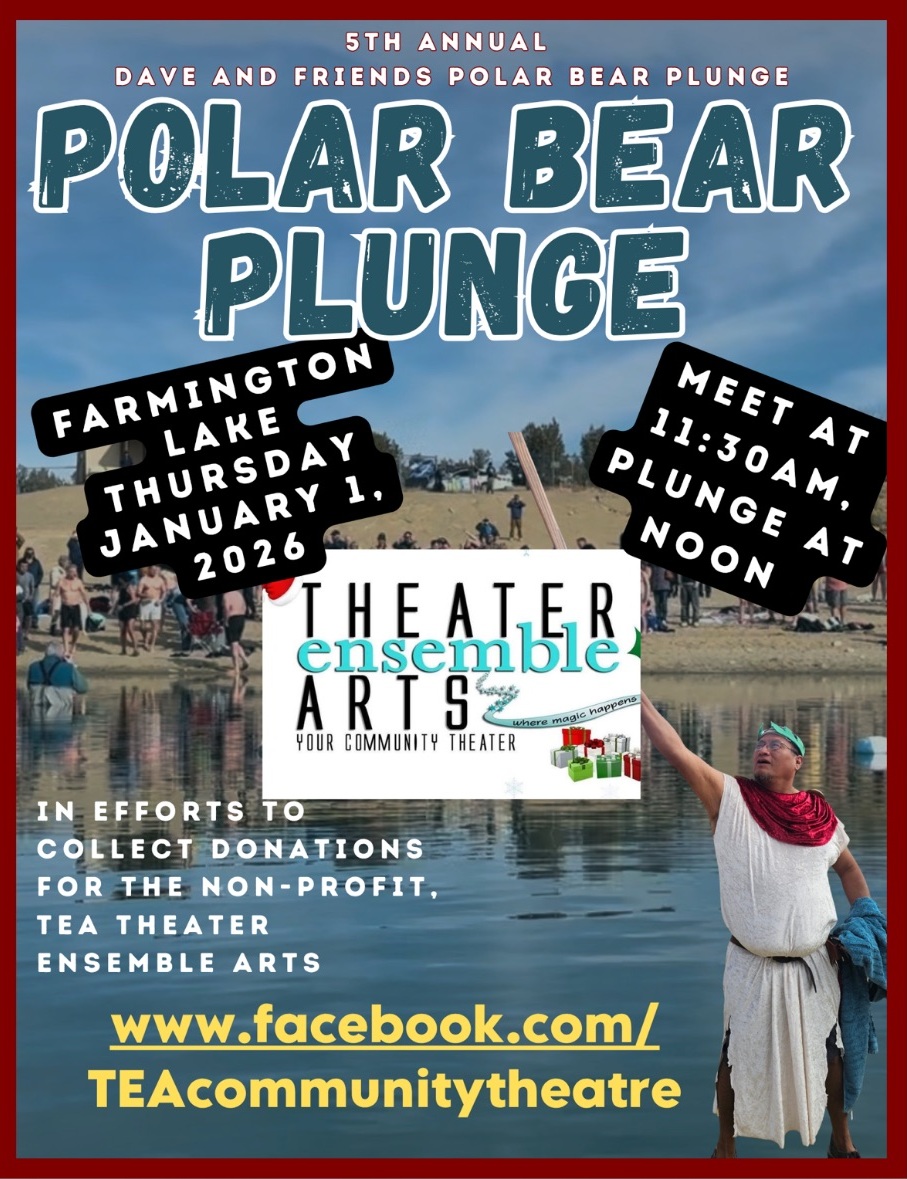 Join in the chilly fun at The Beach at Farmington Lake! Bring a towel and your water shoes! This event raises funds for a non-profit group each year. This year, contributions go directly to Theater Ensemble Arts - your community theatre. Challenge yourself to a dip in beautiful Farmington Lake on New Year's Day! Stay tuned for more details. Please contact Dave at 505-860-2652 if you would like to sponsor this event.