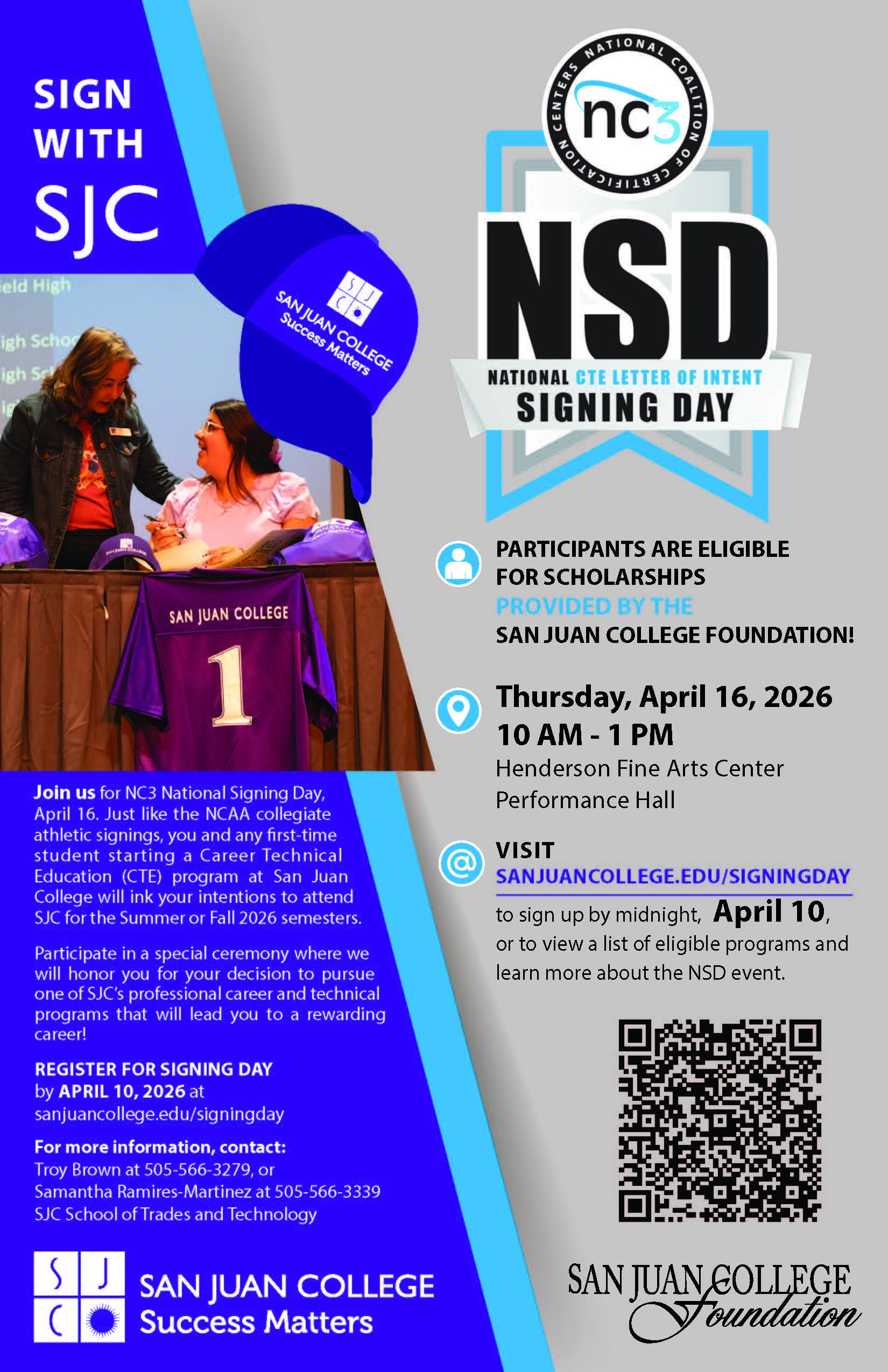 San Juan College (SJC) is excited to announce its 5th Annual NC3 National Signing Day event, set to take place on Thursday, April 16, from 10 a.m. to 1 p.m. in the Henderson Fine Arts Center Performance Hall. This celebratory event will also be live-streamed on SJC’s YouTube and Facebook page, allowing friends and family to join virtually.