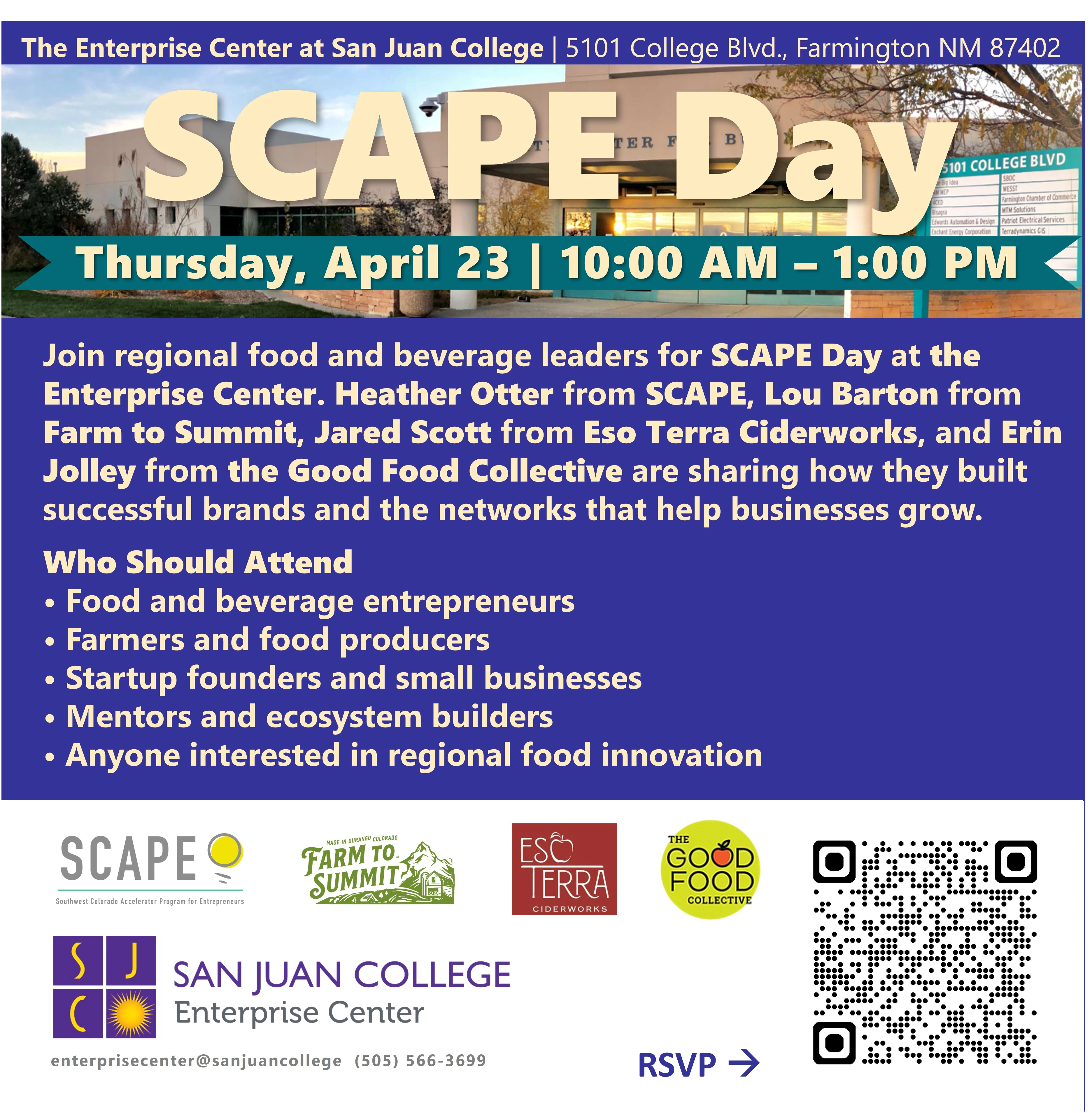 Ready to grow your food or beverage business? Join San Juan College for SCAPE Day at the Enterprise Center, where regional leaders share how they built thriving brands and powerful networks.