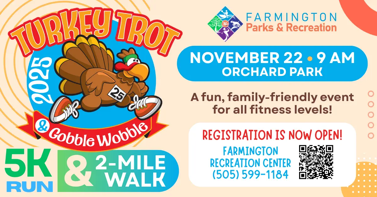 Join us for Farmington's annual 5K Turkey Trot and 2-mile Gobble Wobble in historic downtown. Burn off some holiday calories and help a local charity (a percentage of the proceeds benefit a local charity - TBD). The event starts and finishes at Orchard Park on Main Street, Farmington. Awards follow the conclusion of the run. For more info and registration contact 505-599-1184.