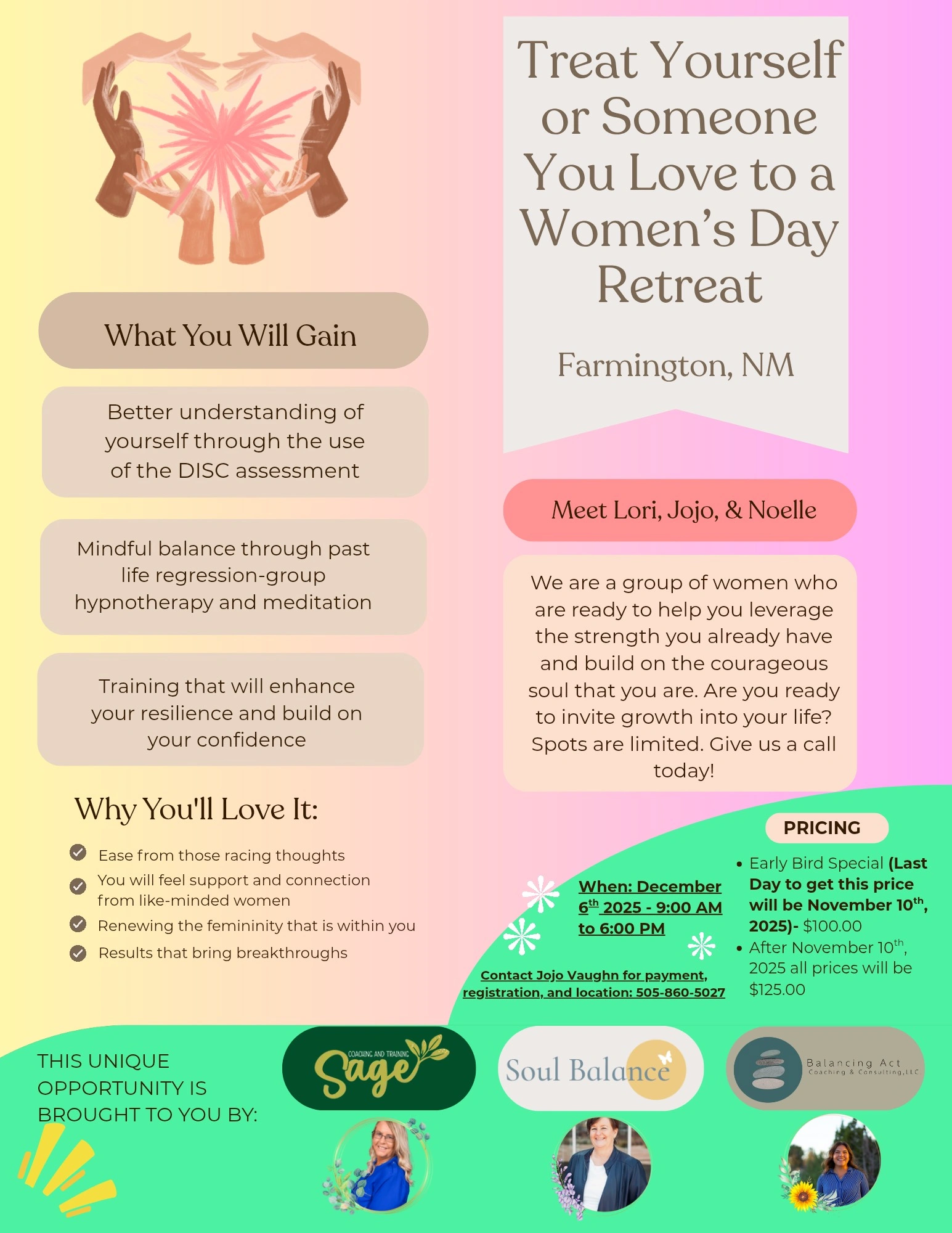 Come join us for this wonderful one day workshop in Farmington NM. Explore classes designed to help you better understand yourself and others, including Personality Styles—and how to understand yourself and others to better communicate with each other, Hypnotherapy, and Meditation, along with specialized training that will enhance your resilience and build on your confidence.
