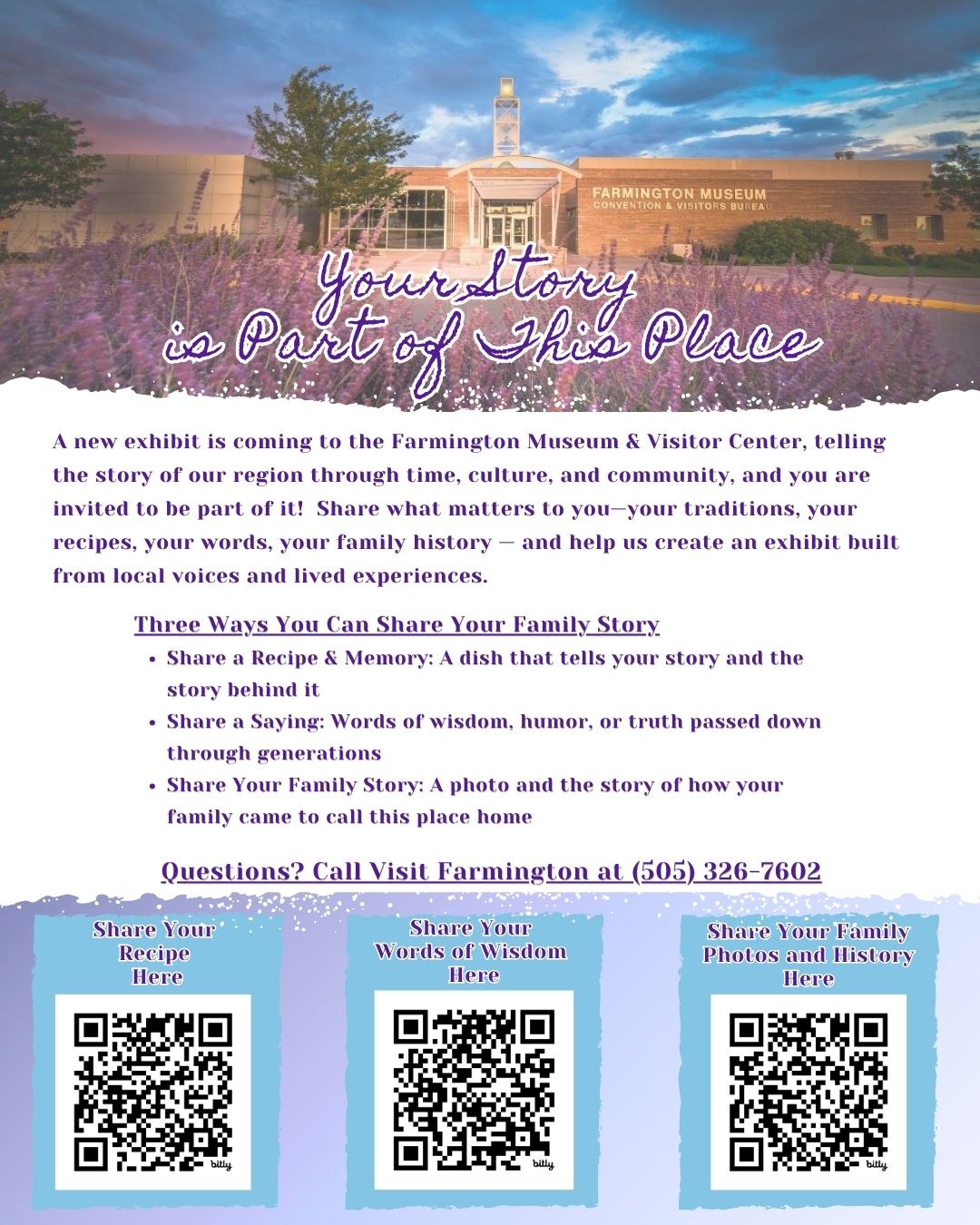 Visit Farmington and the Farmington Museum are in partnership to create a new exhibit that explores the history, cultures, and experiences that have shaped Farmington and San Juan County—from ancient landscapes and early communities to the traditions and stories that continue today.